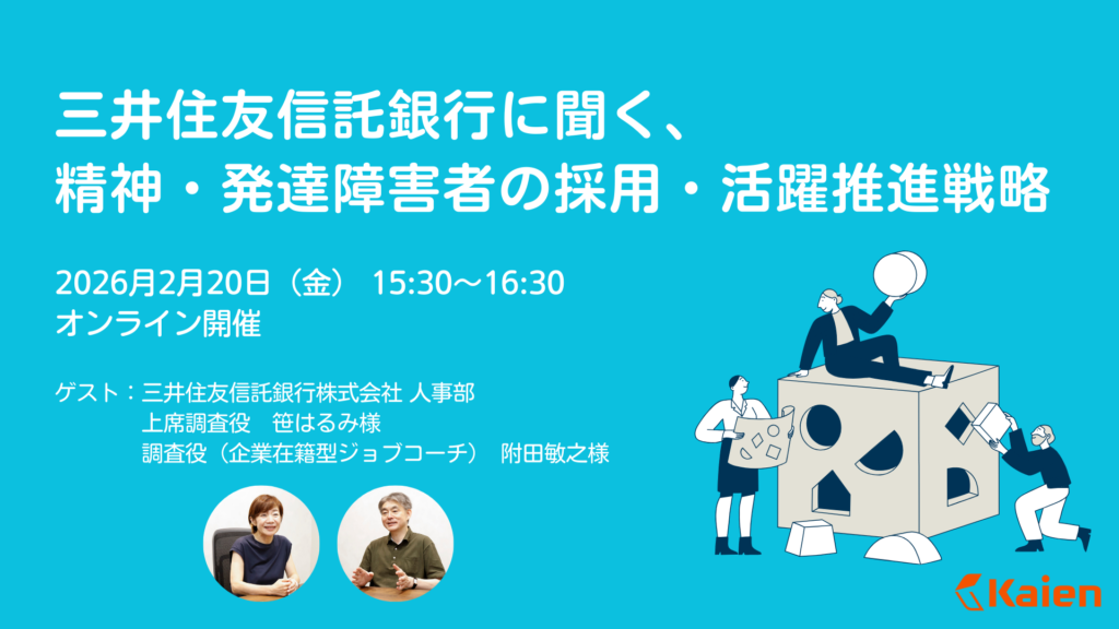本セミナーでは、身体障害のある方を中心としていた障害者雇用から、知的・精神・発達障害のある社員の雇用拡大を目的とした取組「DE&Iラボ」を経て、さらに現在は本部各部へのインクルーシブ型の個別配置へと、着実に精神・発達障害(および知的障害)の方の活躍の場を広げられている三井住友信託銀行株式会社様をゲストとしてお招きします。業務切り出しや、受け入れ職場開拓の壁をどのように乗り越えられてきたのか。現場担当者のリアルな視点から、具体的なプロセスとポイントをお話しいただきます。